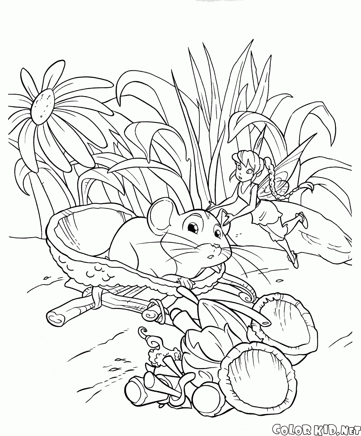 Неожиданный испуг доброго мышонка. Мышонок забился в повозку, а весь урожай высыпался на землю. Фея утешает бедного зверька.