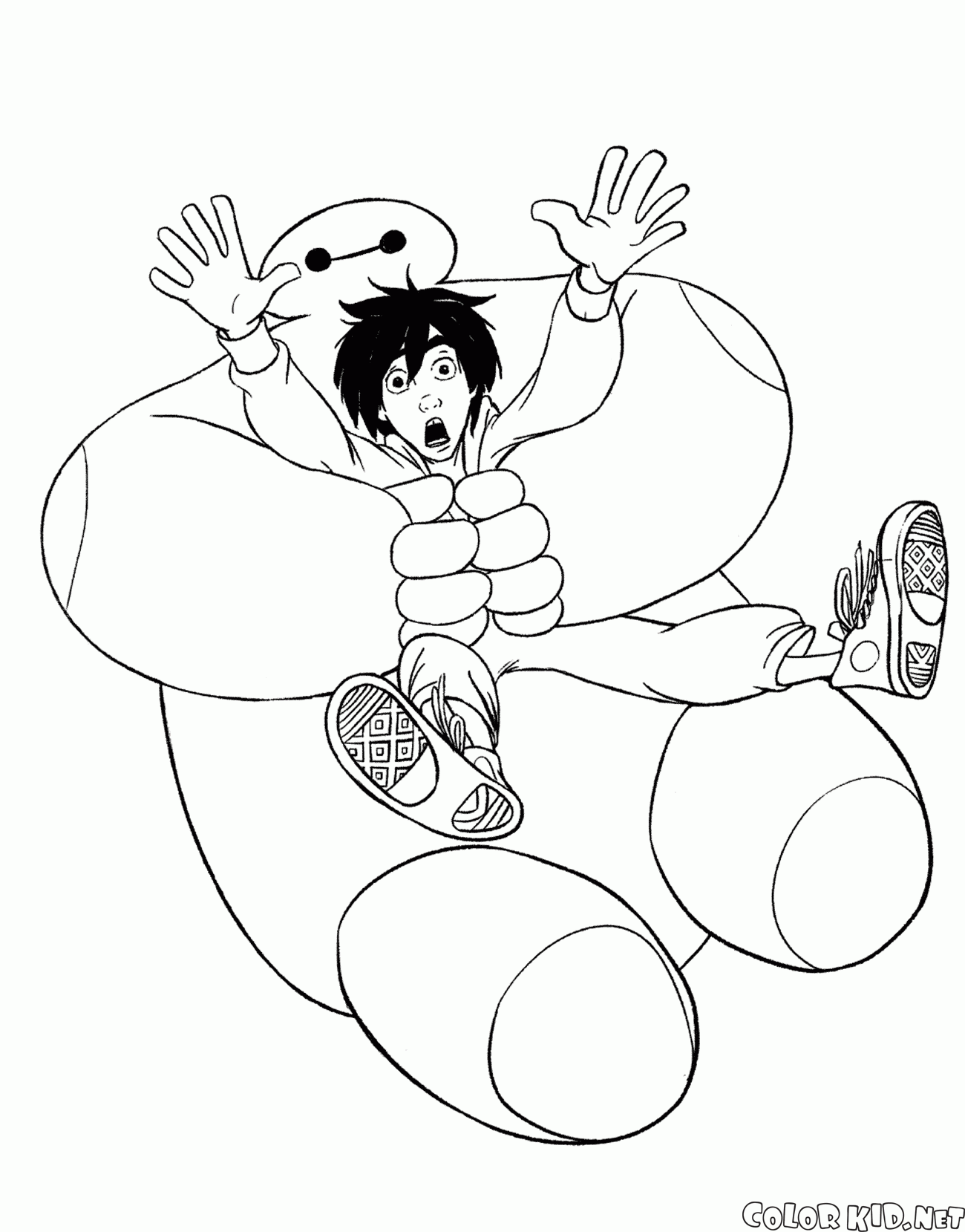 Хиро приземлится на Беймакса. Удачное приземление на что-то мягкое для 14-летнего изобретателя. Хиро немного в шоке и его глаза широко раскрыты. Бэймакс надежно его держит.