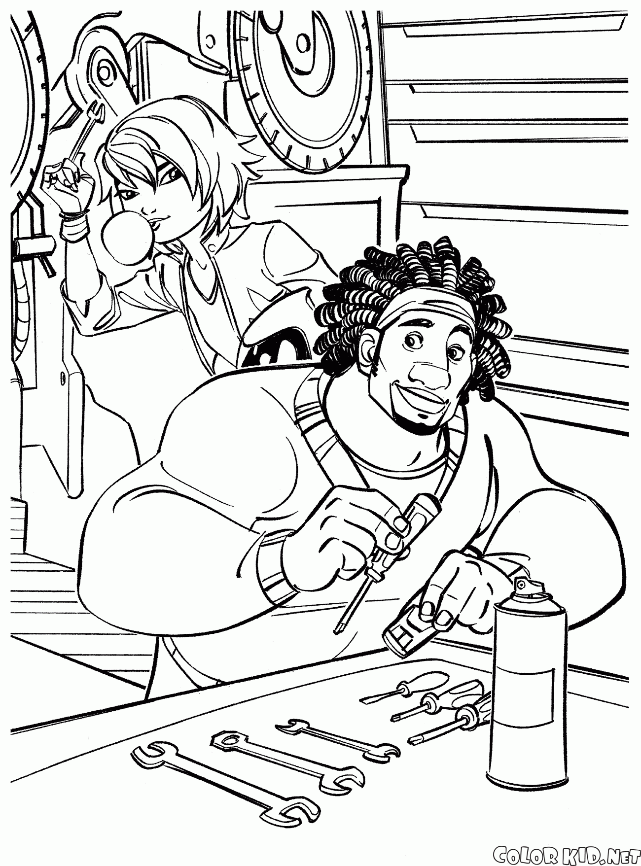 Васаби и ГоГо Тамаго создают что-то новое. У Васаби все инструменты разложены по порядку, но ГоГо скорее всего схватит нужный ей предмет и умчится что-то мастерить.