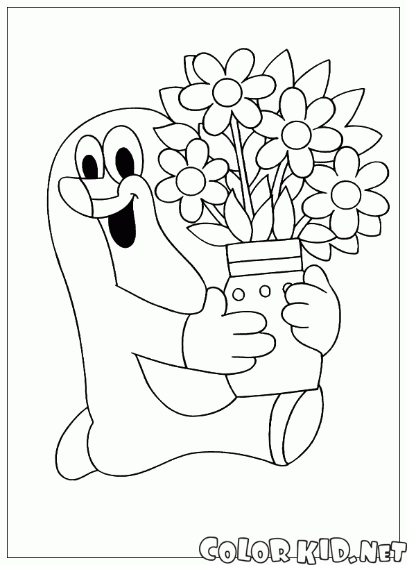 Крот несет большую вазу с цветами. Наверно, он сам собрал эти красивые цветы, выбрал вазу и сейчас готовится ее кому-то подарить. Крот умеет быть вежливым и галантным.