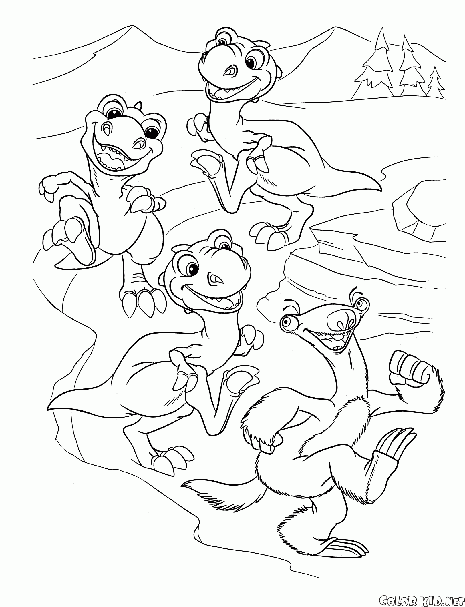 Сид обучает маленьких динозавриков веселью. Ленивец ведет деток по руслу ручья. Маленькие тиранозавры вышагивают в восторге за своим учителем.