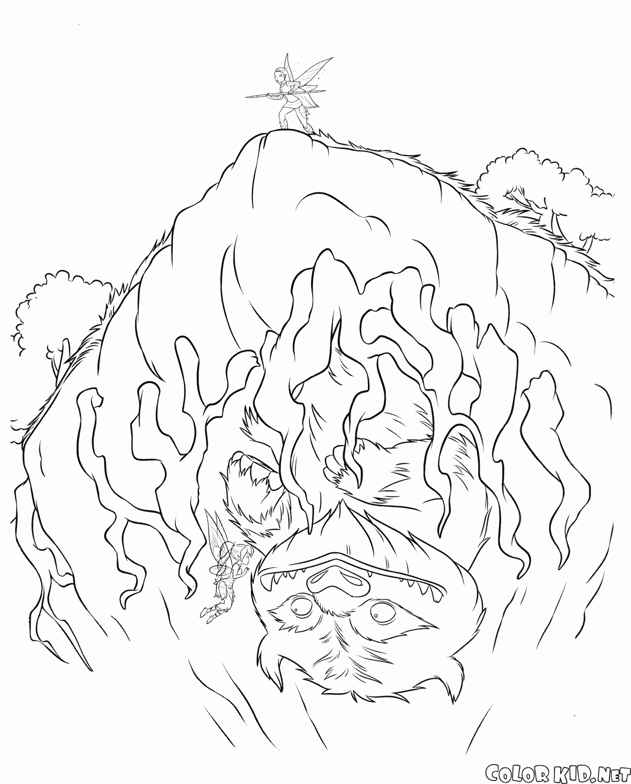 Чудовище надёжно скрылось от погони фей. Фея с шестом стоит на вершине холма и ищет зверя, а он спрятался в пещере под холмом и повис вверх ногами.