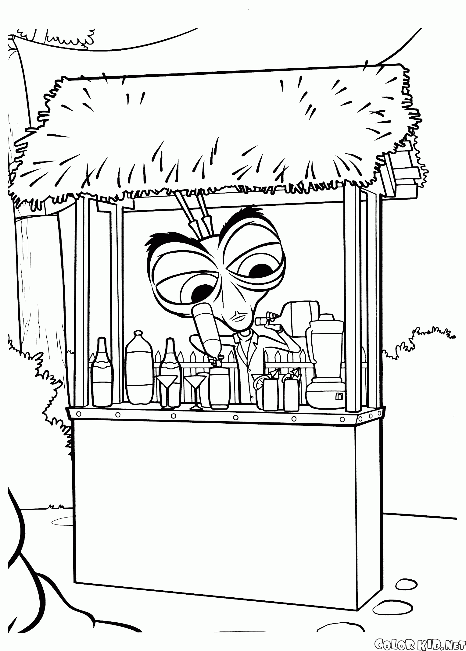 Таракан решил устроится барменом на Земле. Сейчас он смешивает коктейли за стойкой бара. Здесь его знание химии пригодится людям. Крыша бара покрыта соломой.