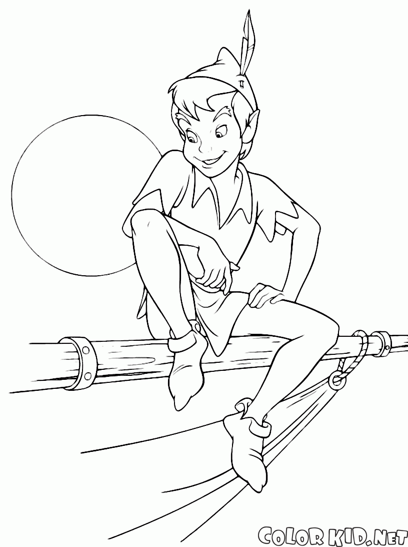 Питер Пэн сидит на мачте пиратского корабля. Ярко светит Луна и Питер видит всё, что делают внизу пираты. Паруса наполнены ветром и корабль идет вперед.