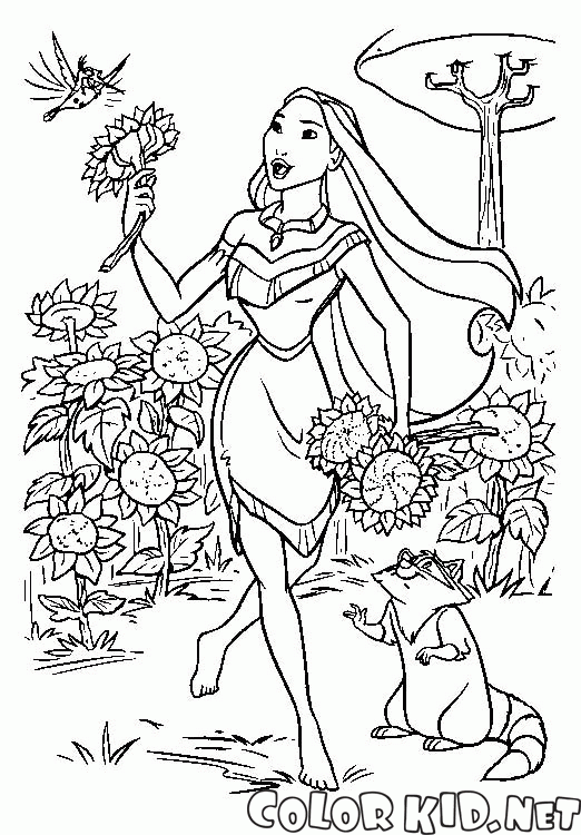 Покахонтас радуется удивительной красоте природы. У нее длинные развевающиеся черные волосы и смуглая кожа. Она несет в руках цветки подсолнуха. Птица и енот очень рады ее видеть.