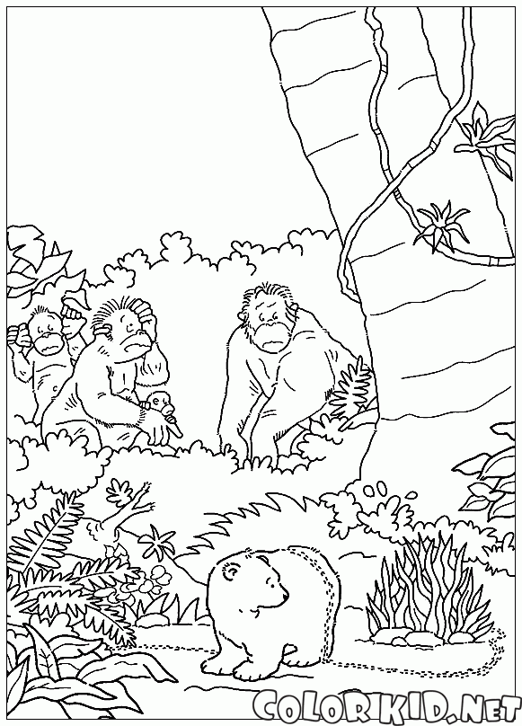 Медвежонок очень испугался колонны муравьёв. Организованные муравьи идут колонной по тропе и, наткнувшись на медведя, перелезают через него. Семья обезьян удивленно смотрит на эту ситуацию.