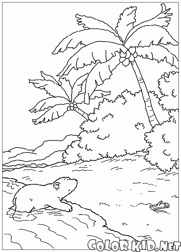 Ларс смог успешно добраться до берега. На этой земле растут пальмы и пышные зеленые кусты, видимо полярного медвежонка унесло далеко на юг. Ларсу в его теплой шубе придется жарковато в таком климате.