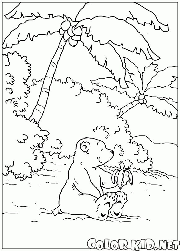 Медвежонок ест банан, который нашел случайно. В тропиках можно найти много вкусной еды, которая растет прямо на деревьях. Позади Ларса виднеются кокосовые пальмы, на которые можно забраться и полакомиться.