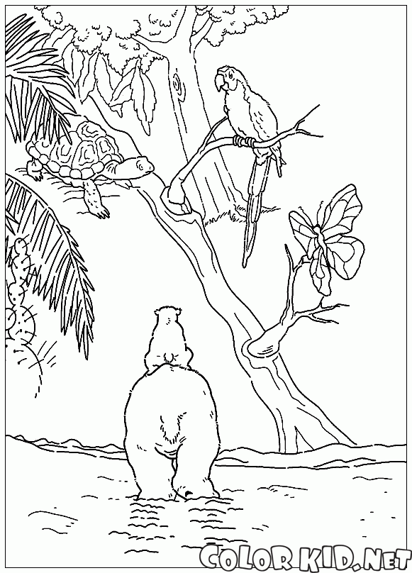 Медвежонок вместе с мамой возвращается в тропики. Вокруг они видят черепаху, попугая и большую бабочку.Маме Ларса очень интересно смотреть по сторонам.