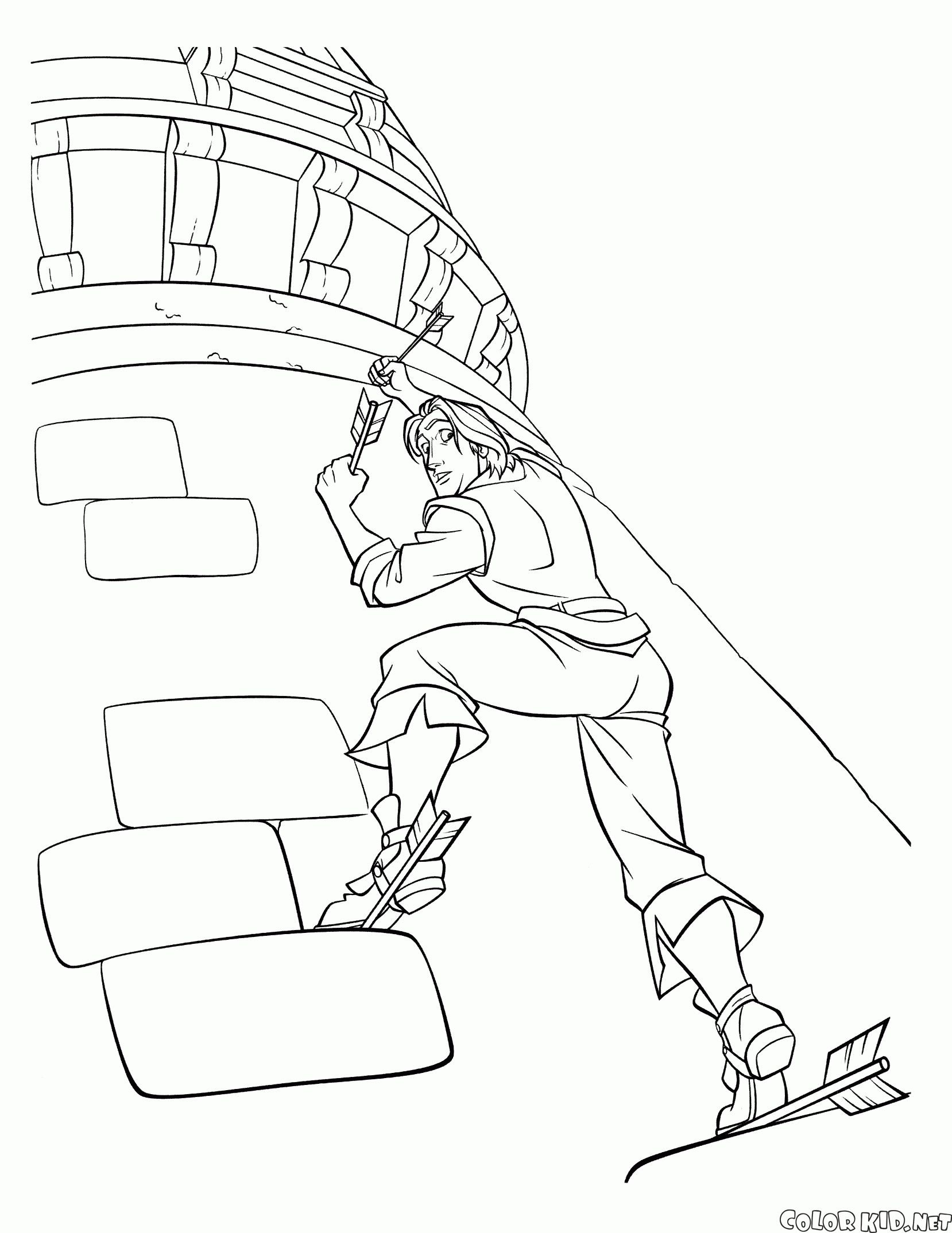 Флинн подымается вверх по башне чтобы спасти Рапунцель. Ловкий вор выстрелил из лука несколько стрел в башню, и теперь лезет наверх, используя торчащие стрелы как опору для ног.