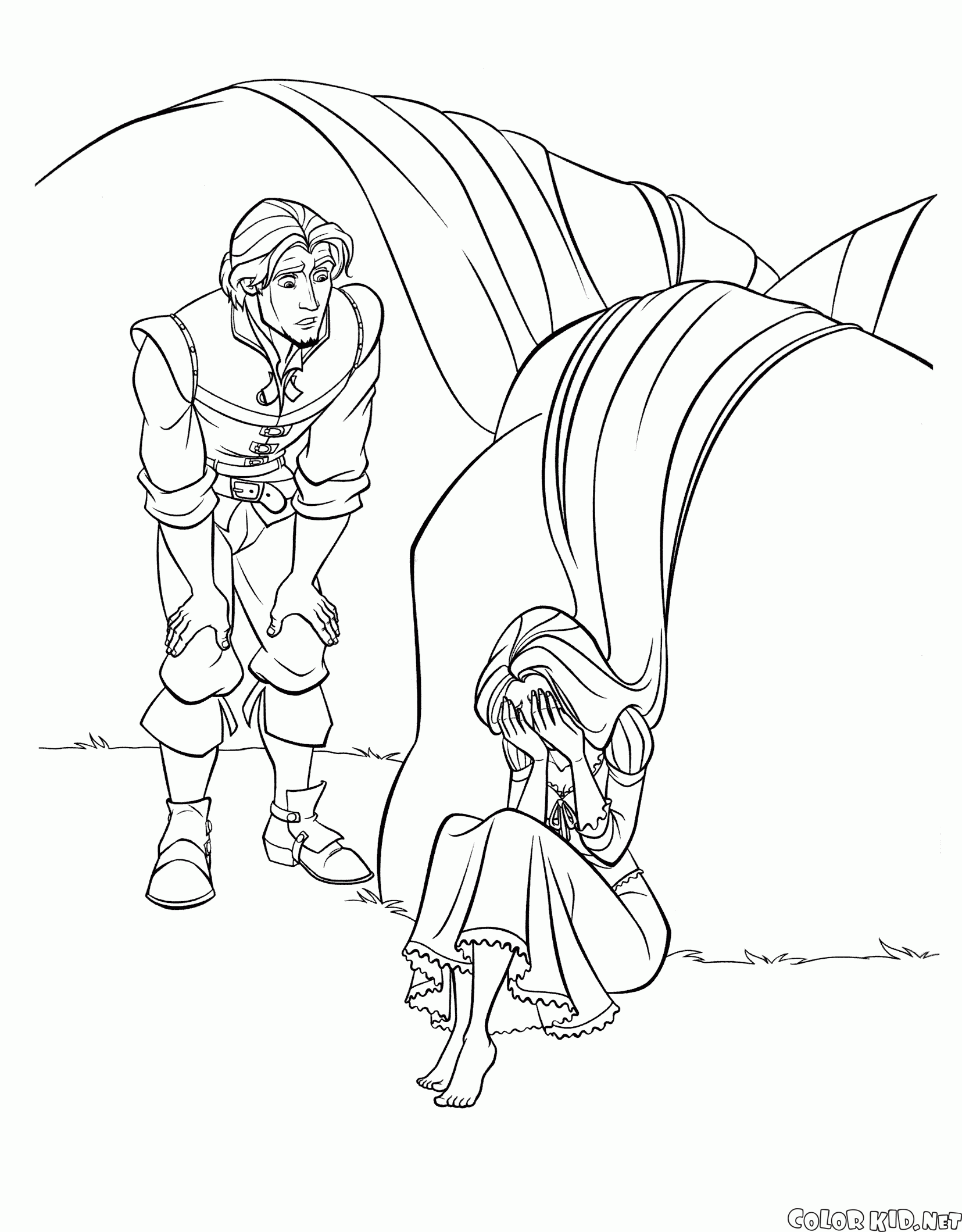 Рапунцель расстроена жизненными трудностями. Она сидит, закрыв лицо руками, и плачет. Флинн склонился над ней и хочет чем-то помочь. Длинные волосы принцессы разложены на камнях.