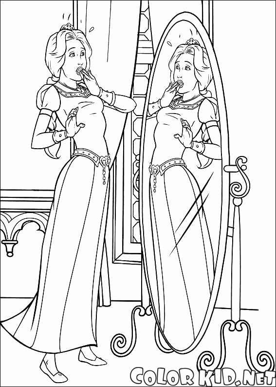Фиона также решила выпить чудо зелье. Из зеленой великанши она превратилась в прекрасную принцессу. Сейчас Фиона смотрит в зеркало и не узнает себя.