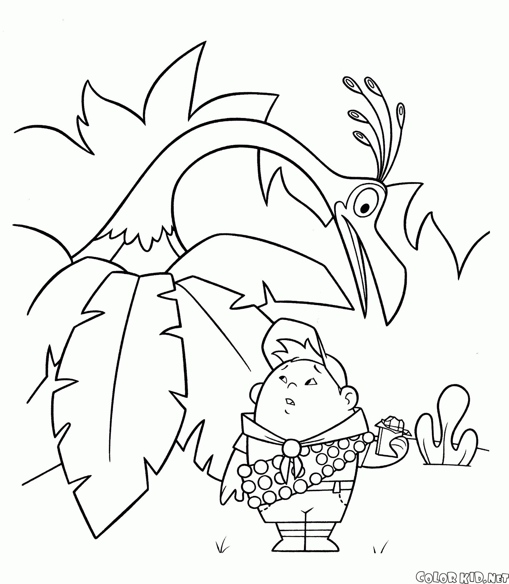 Скаут Рассел нашел друга в мире животных. Удивительная длинношеяя птица с удивлением выглядывает из зарослей тропического леса. У мальчика в руке шоколад и он смотрит на Кевина с любопытством.