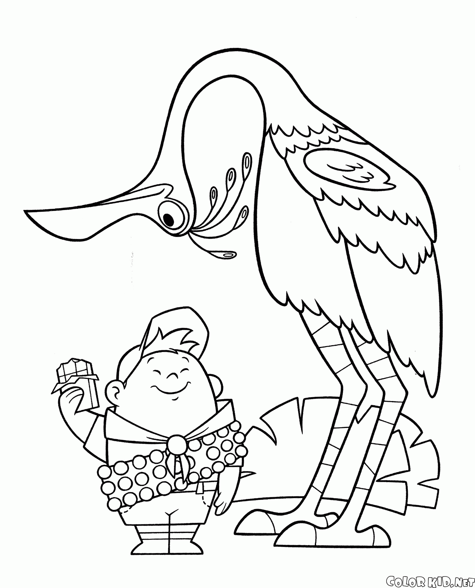 Расселл ест сладкую шоколадку, которую дал Карл. Мальчик большой сладкоежка и сейчас он зажмурился от удовольствия. Птица смотрит в ожидании, может и ей перепадет кусочек ?