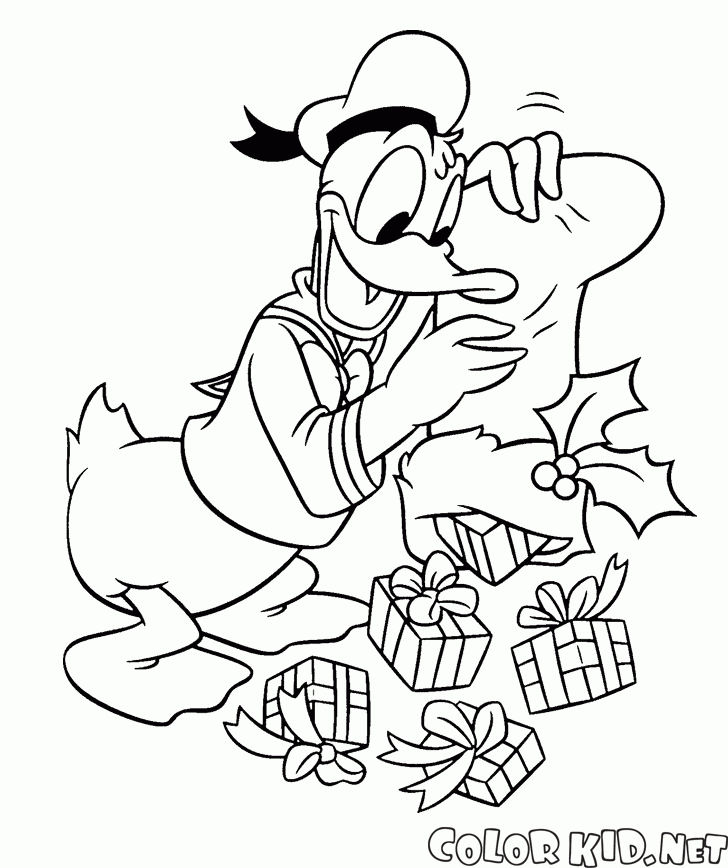 Раскраску для детей Дональд и подарки вы можете бесплатно скачать и распечатать на нашем сайте.
