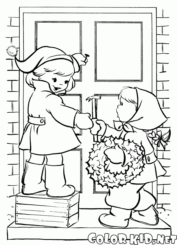 Раскраску для детей Дети вешают венок вы можете бесплатно скачать и распечатать на нашем сайте.
