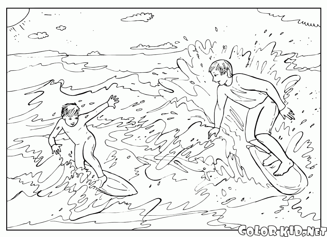 Раскраску для детей Серфинг в море вы можете бесплатно скачать и распечатать на нашем сайте.